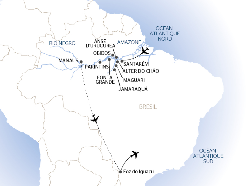 le vol Paris(1)/Santarem et Foz d’Iguaçu/Paris - les taxes aéroport (163 € - tarif 2025) - le vol domestique(1) Manaus / Foz d’Iguaçu - les taxes aéroport (30 € - tarif 2025) - les transferts mentionnés au programme – la croisière en pension complète du dîner du 1er jour au petit déjeuner buffet du dernier jour - les boissons incluses à bord (hors cartes spéciales) - le logement en cabine double climatisée avec douche et WC - - la demi-pension en hôtel 5* NL à Foz d’Iguaçu les J12 au J15- les déjeuners des J12, 13 et 14 - les visites mentionnées au programme - les services d’un guide conférencier naturaliste - le cocktail de bienvenue - la soirée de gala - l'assurance assistance/rapatriement - les taxes portuaires.
